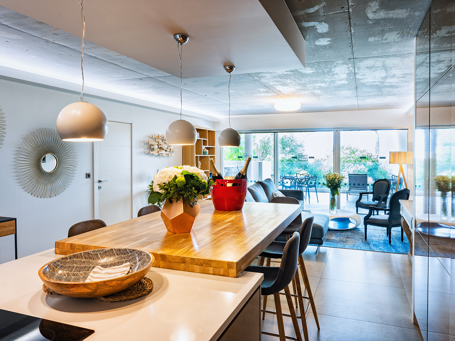 La suite Prestige est un appartement terrasse climatisé de 4 pièces. Elle dispose en outre d’une terrasse majestueuse depuis laquelle vous pourrez admirer le luxuriant jardin et la piscine sur fond de vue mer.